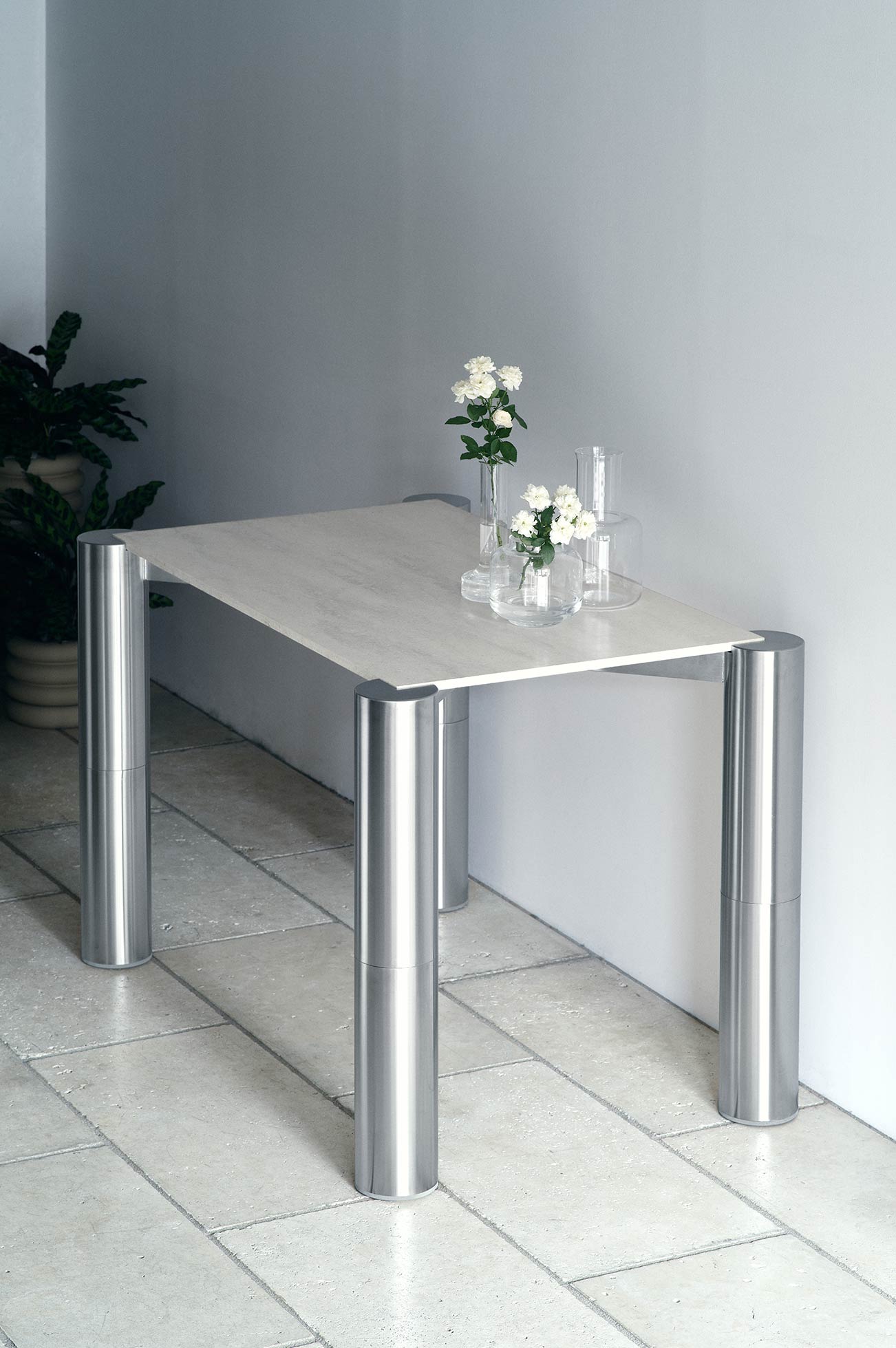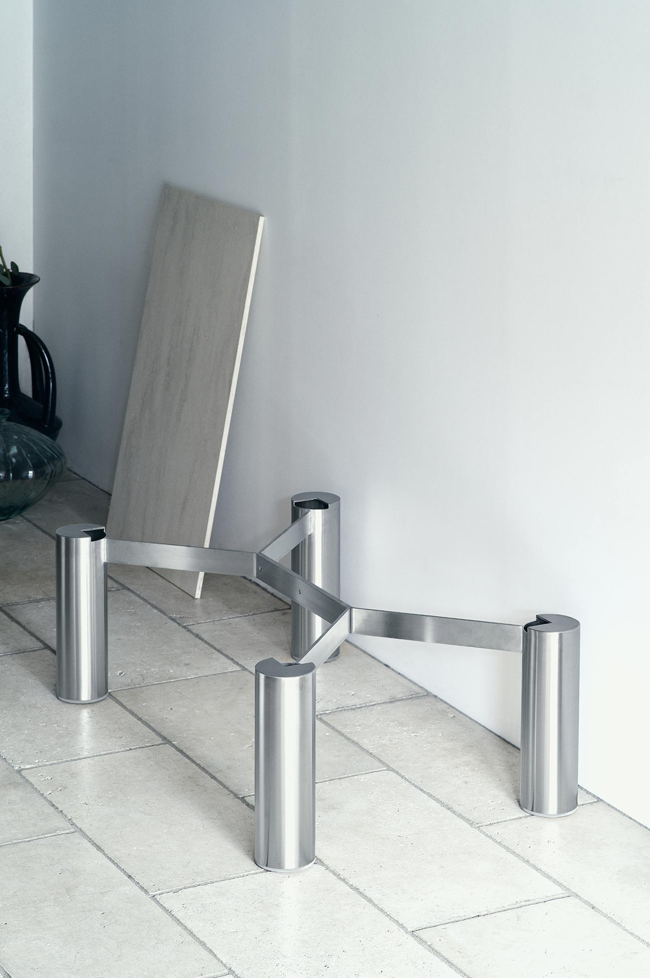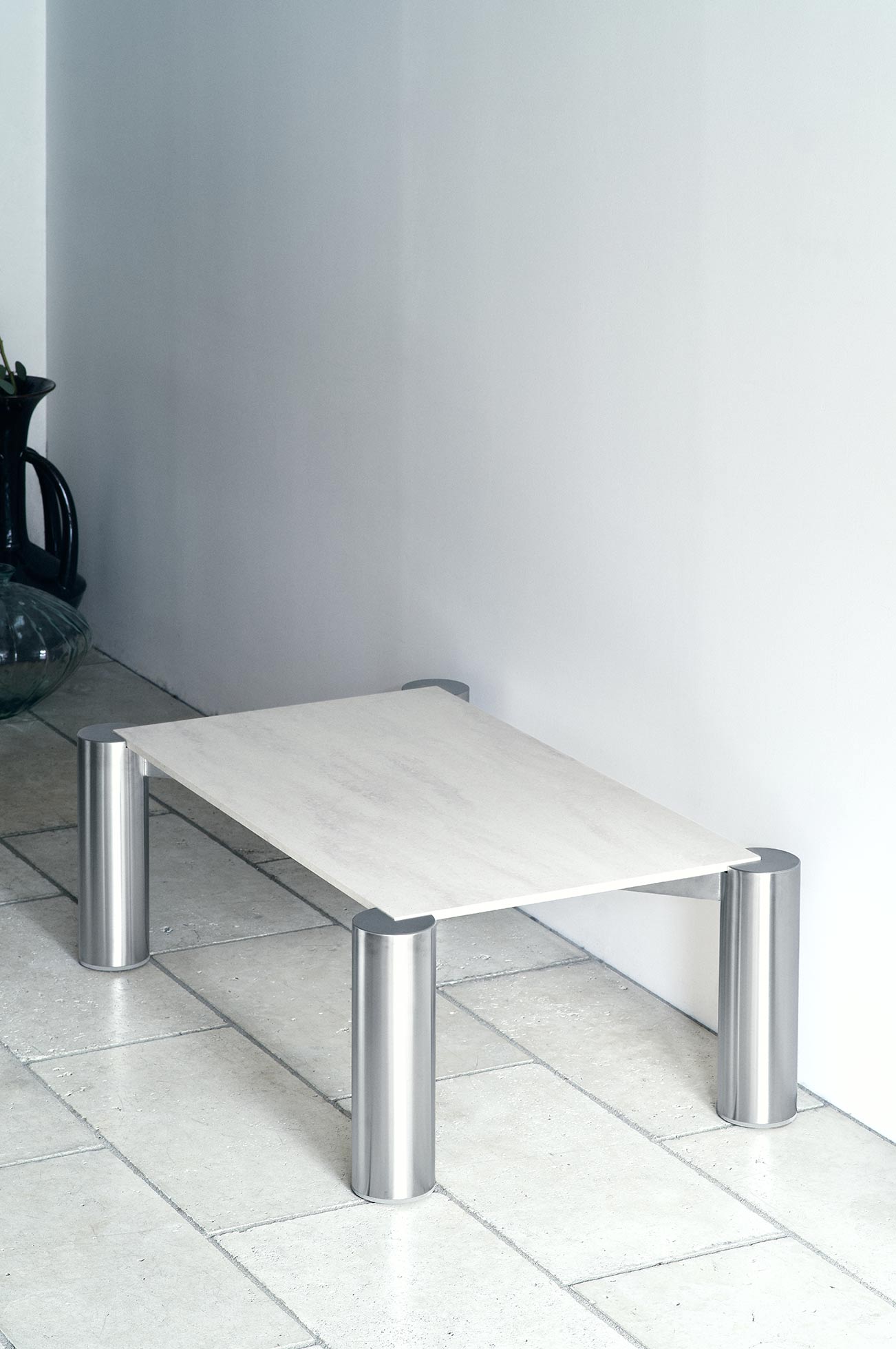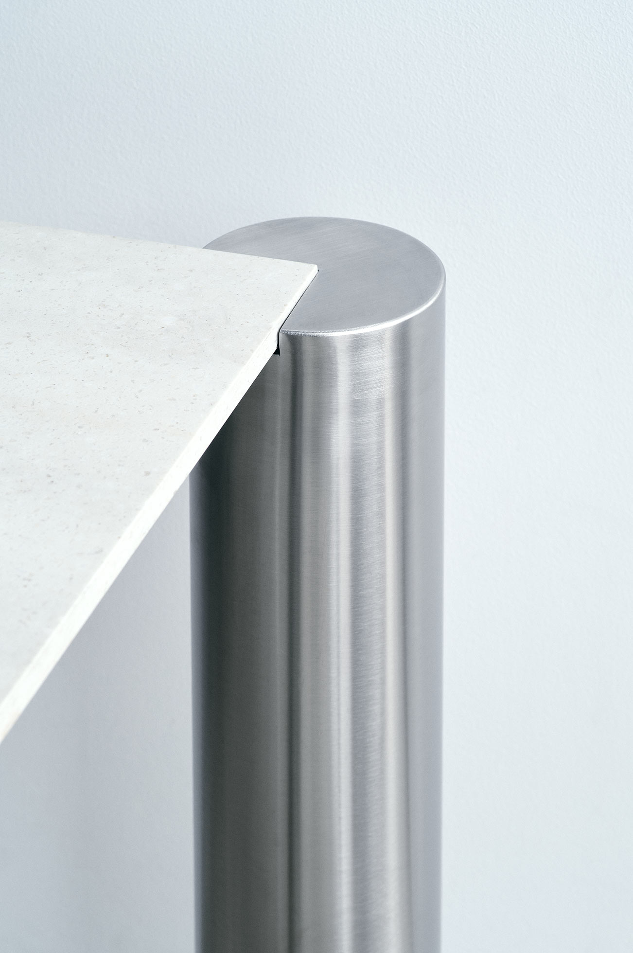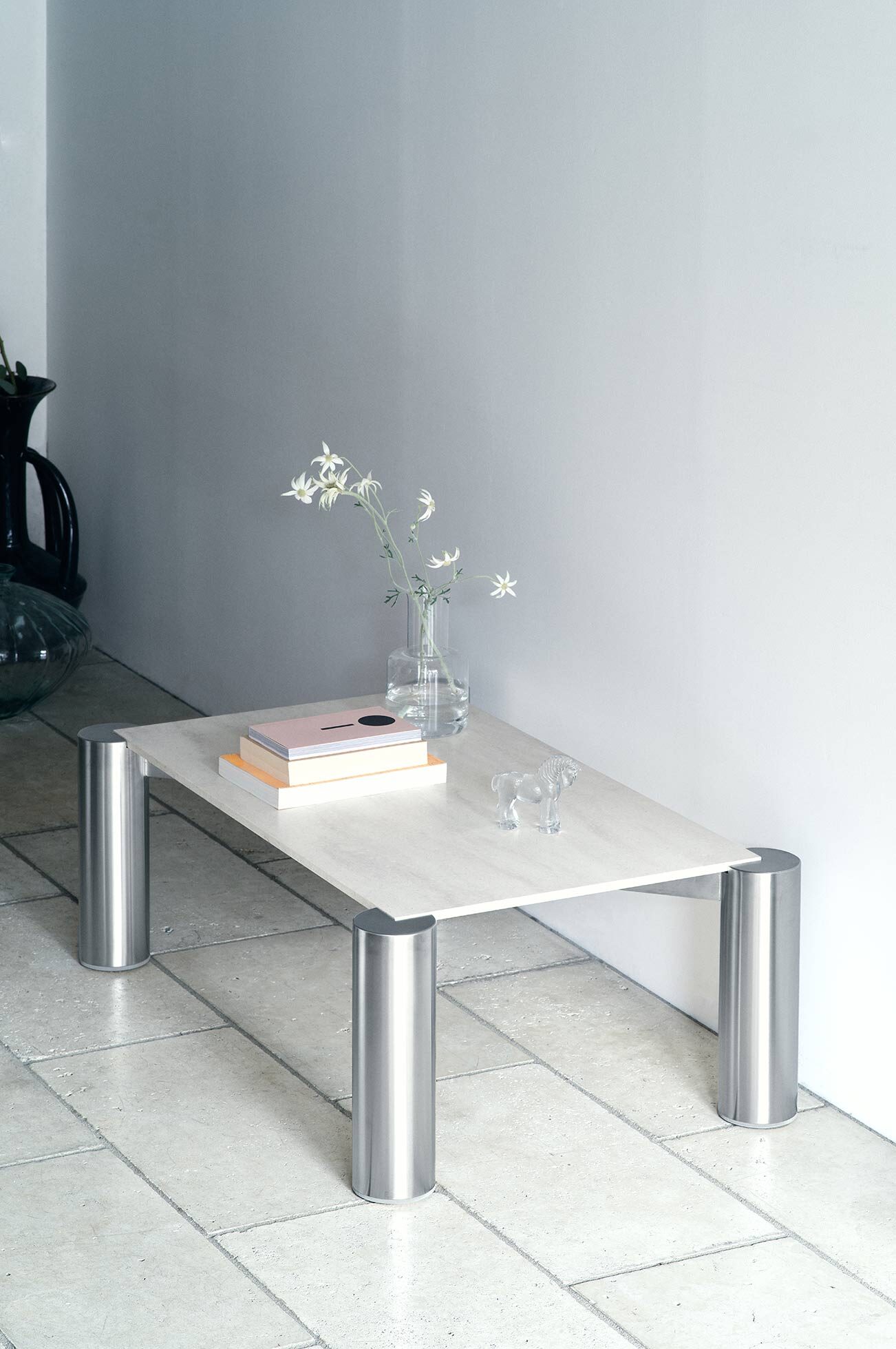 友人邸にデザインしたローテーブル。既存の人工大理石天板を使ってローテーブルをつくる依頼から始まり、人工大理石のコーナーエッジをガードするように、角を面取りした太いステンレス丸パイプの脚を1/4切り欠き、天板を落とし込む構成とした。また、使い方の幅を増やすため、パイプ脚のパーツを追加することで、2段階の高さ調整ができる構造になっている。