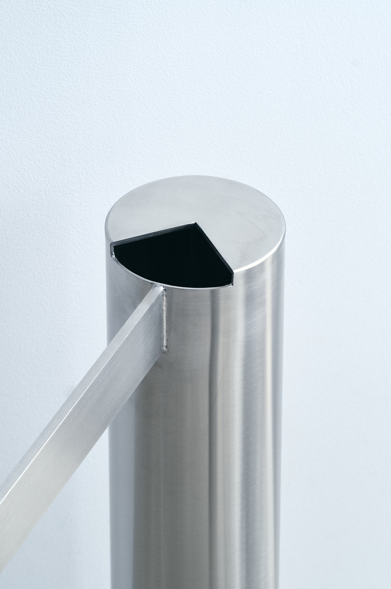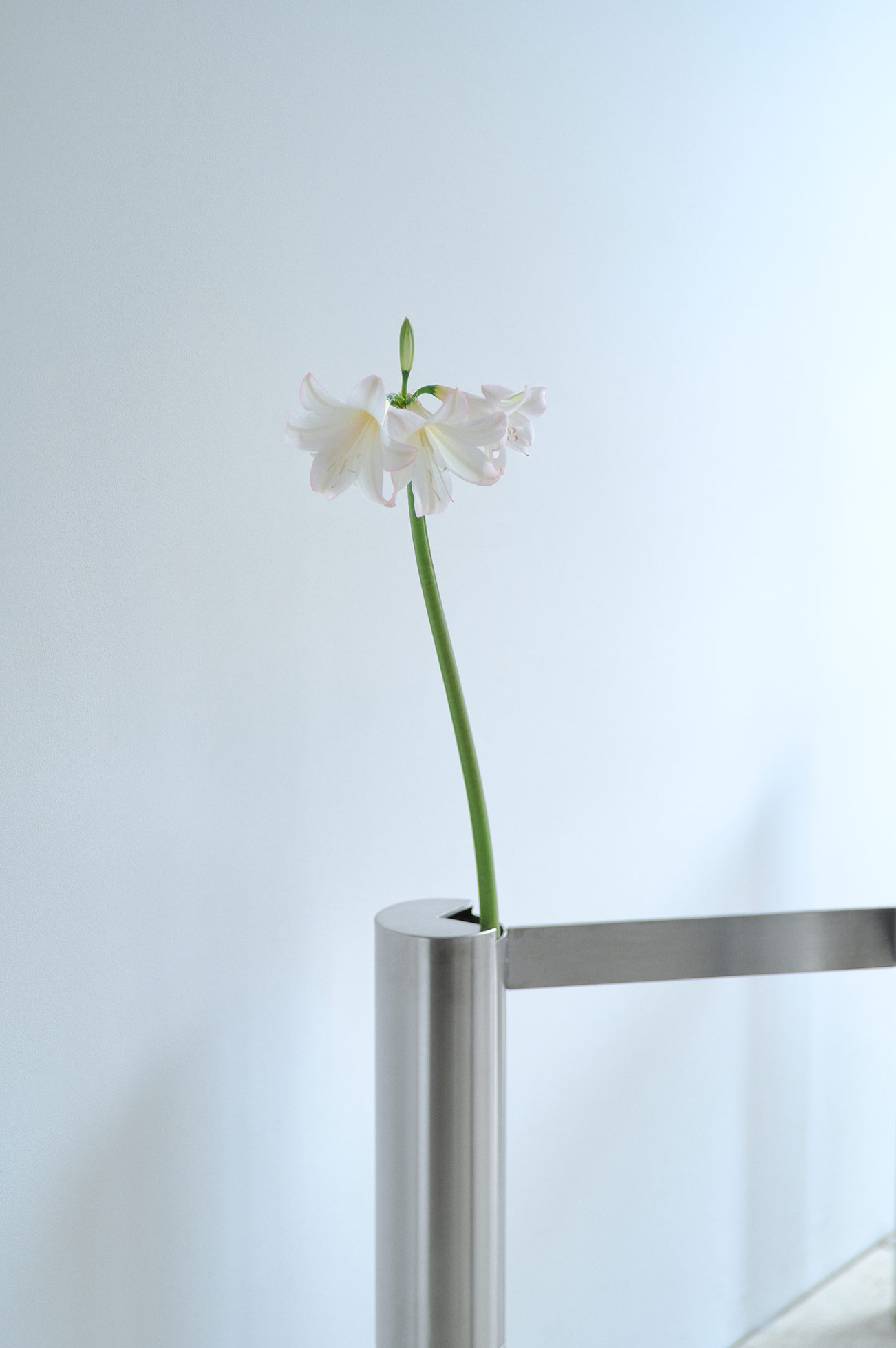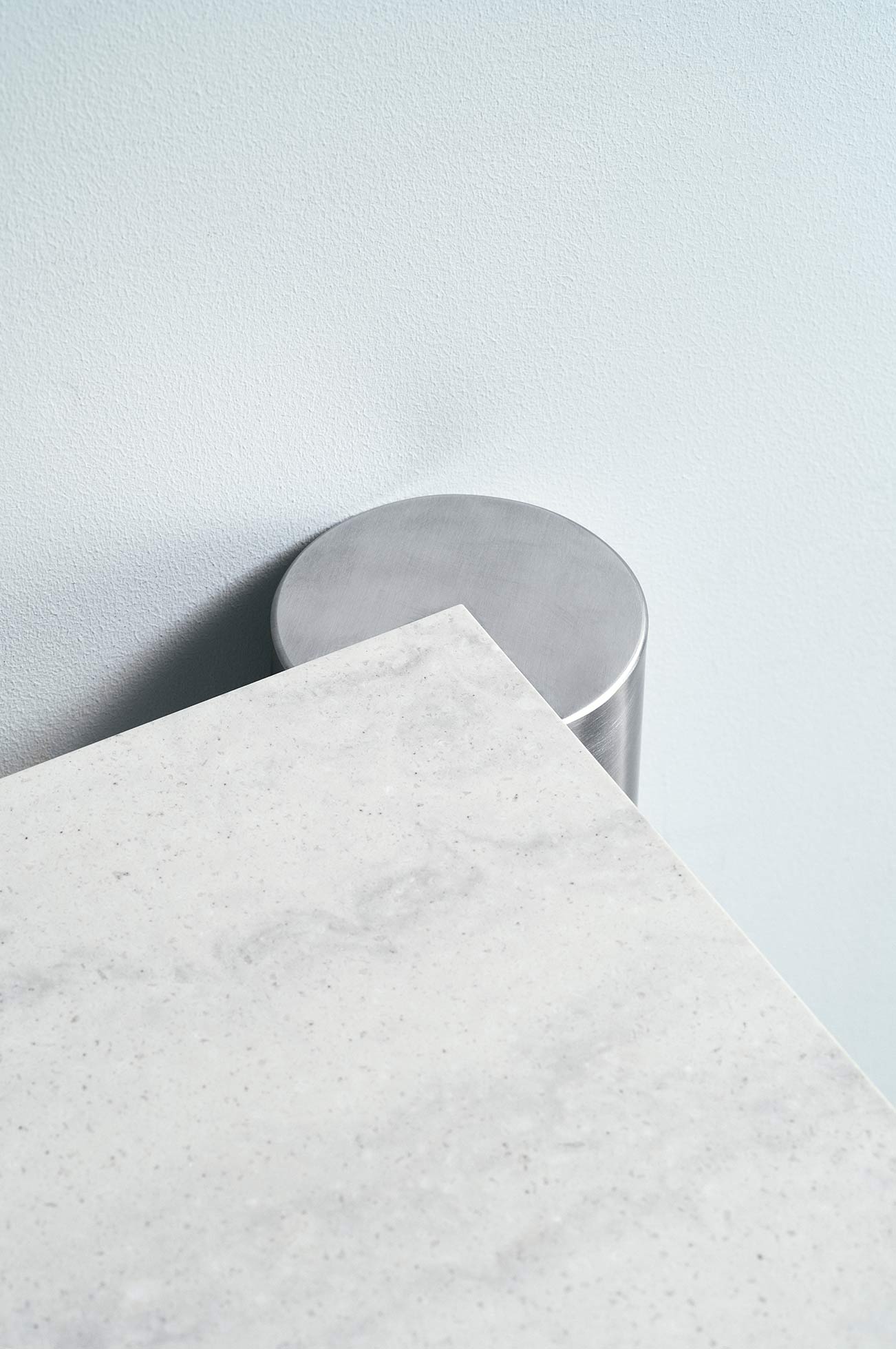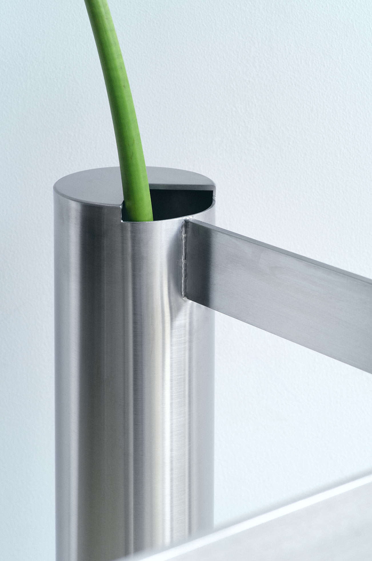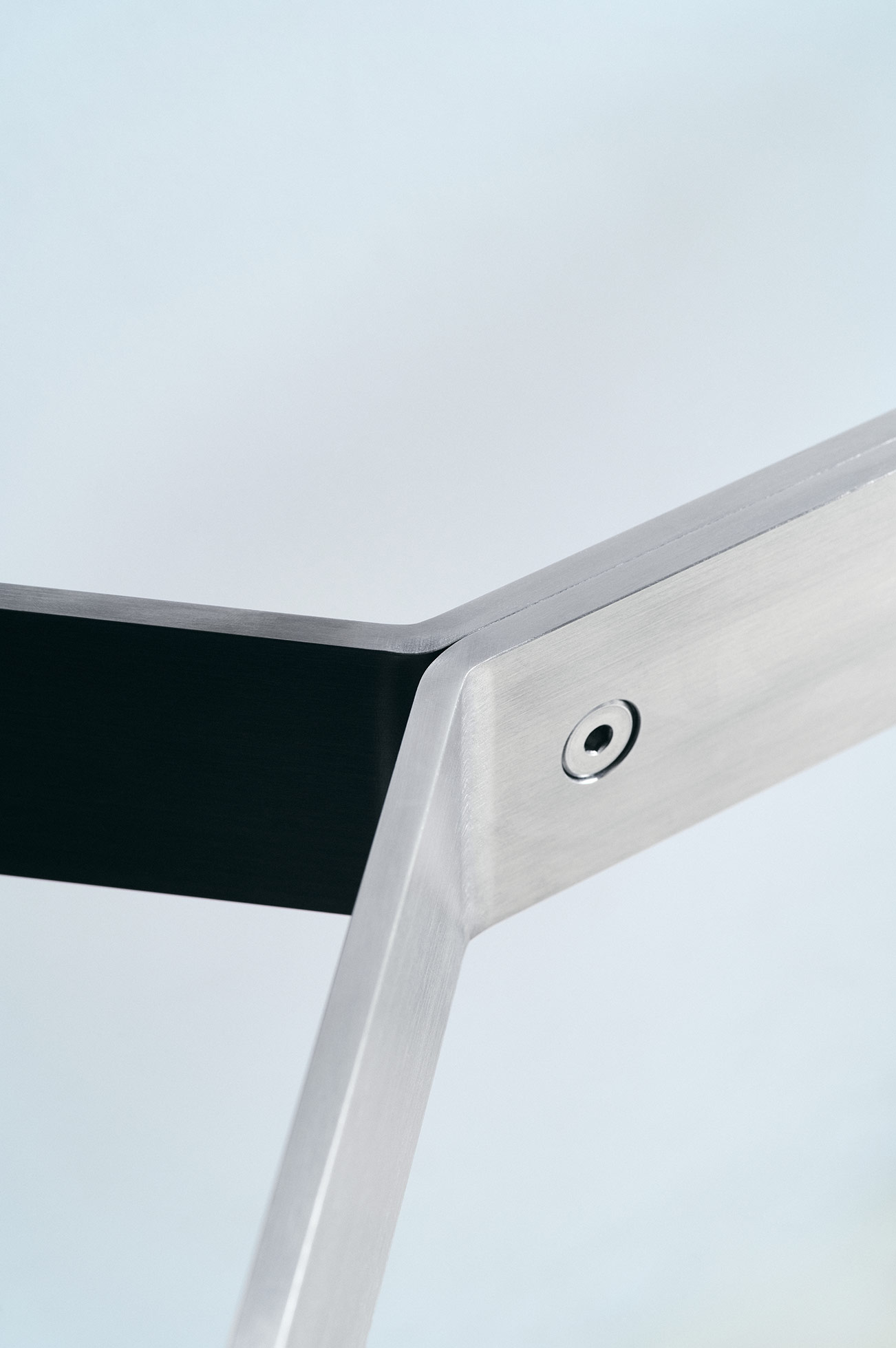 友人邸にデザインしたローテーブル。既存の人工大理石天板を使ってローテーブルをつくる依頼から始まり、人工大理石のコーナーエッジをガードするように、角を面取りした太いステンレス丸パイプの脚を1/4切り欠き、天板を落とし込む構成とした。また、使い方の幅を増やすため、パイプ脚のパーツを追加することで、2段階の高さ調整ができる構造になっている。