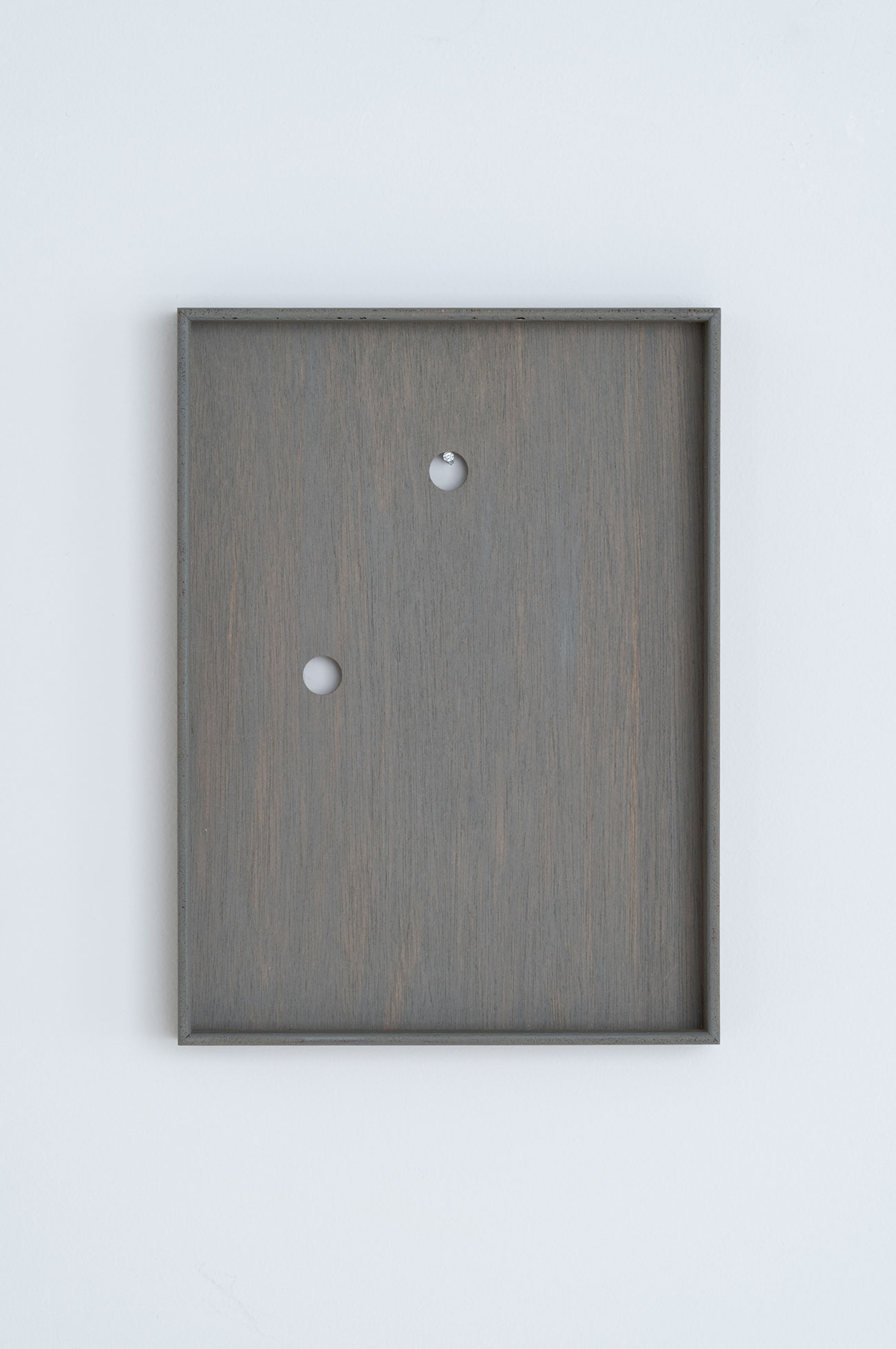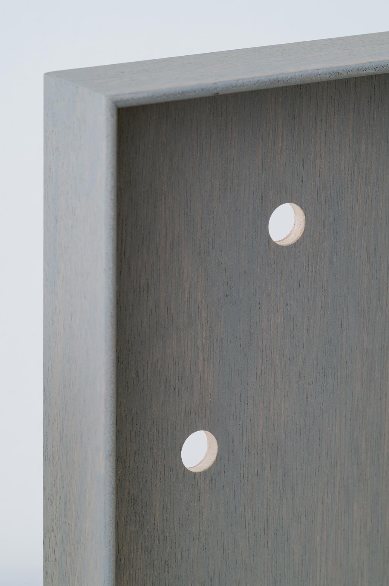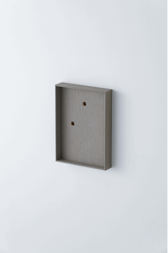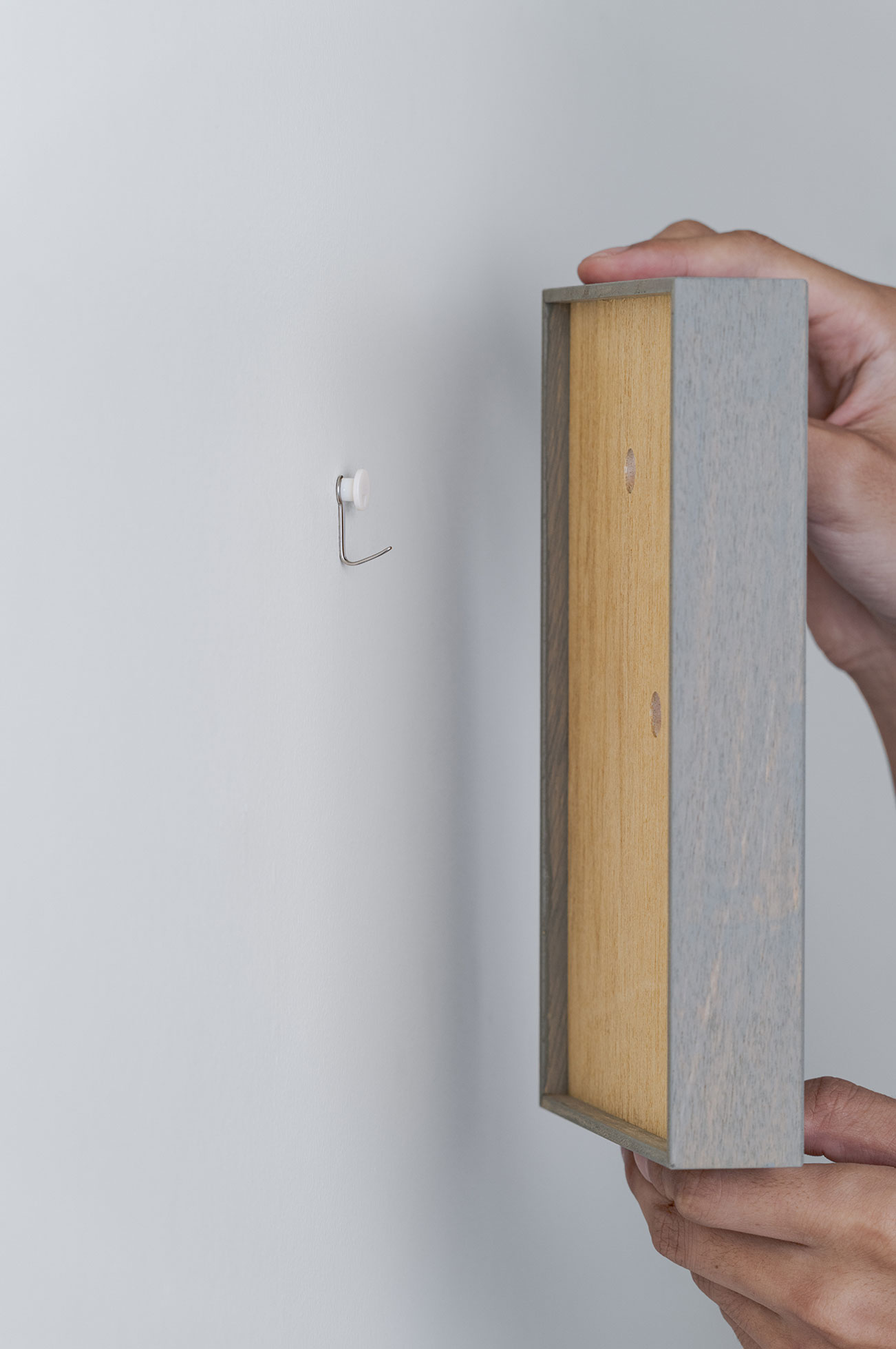アクリルやガラスの無い、シンプルな箱状のフレームとし、裏面には縦と横どちらの向きでも引っ掛けられるよう二つの穴を備えている。