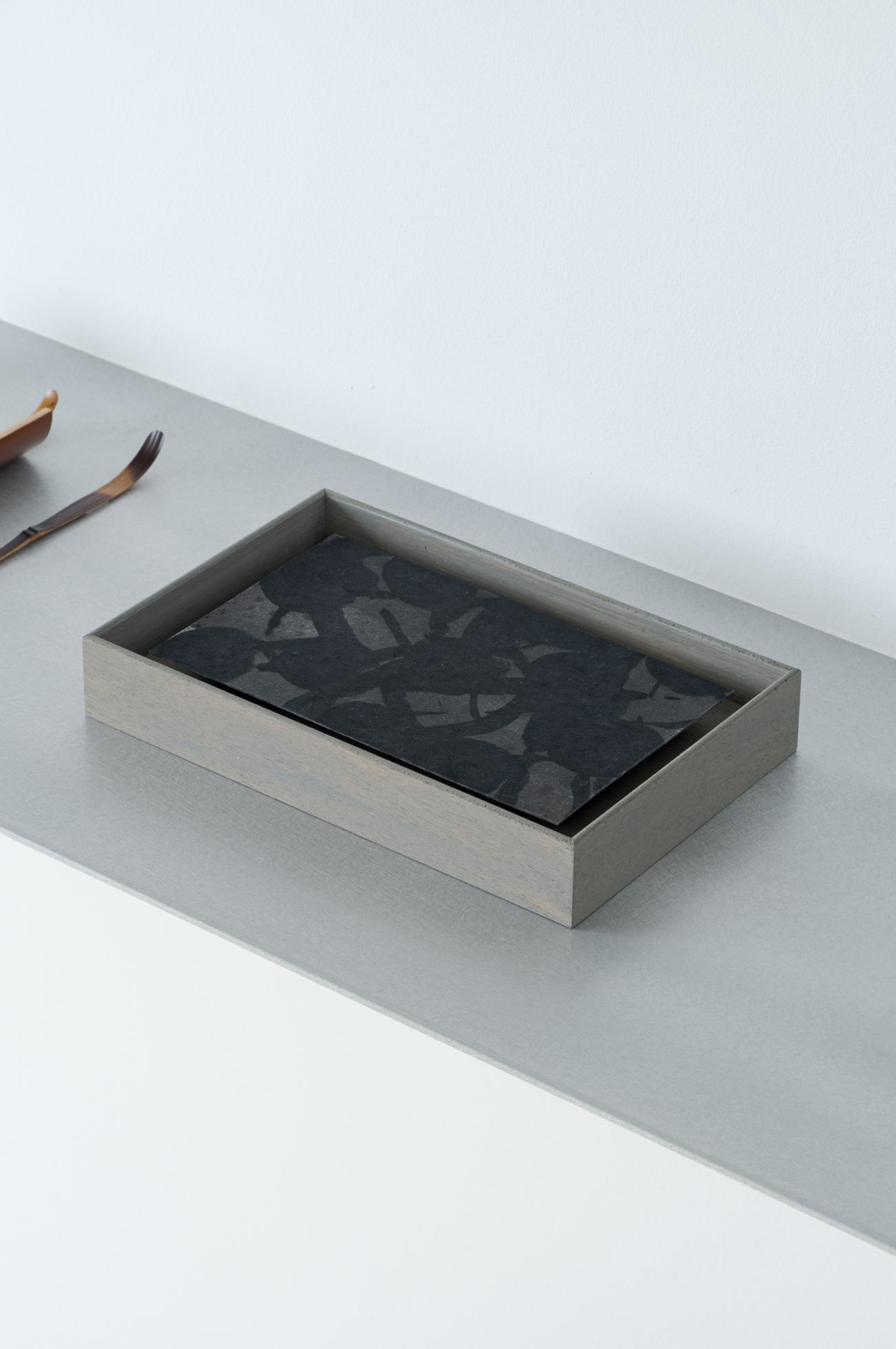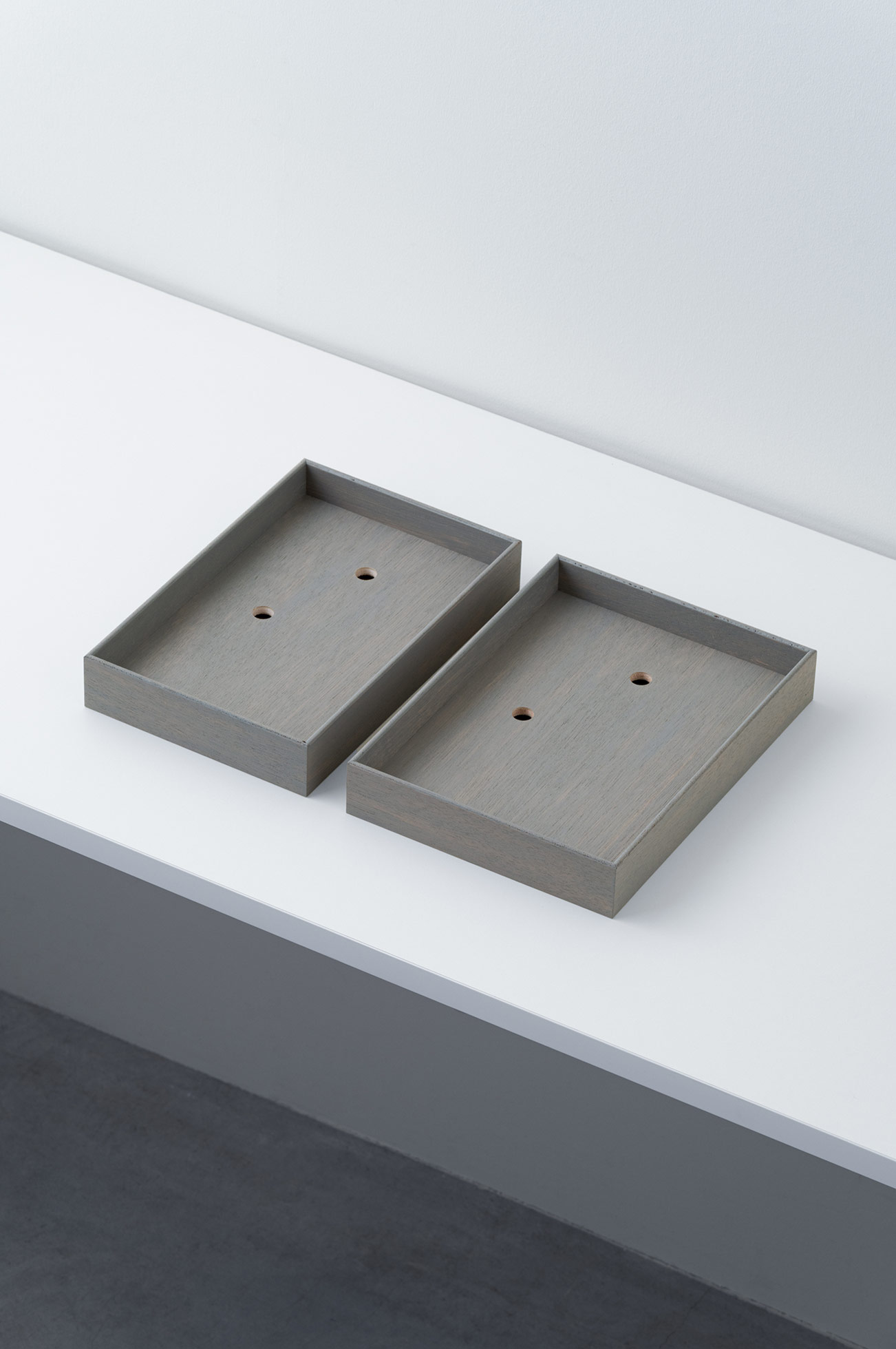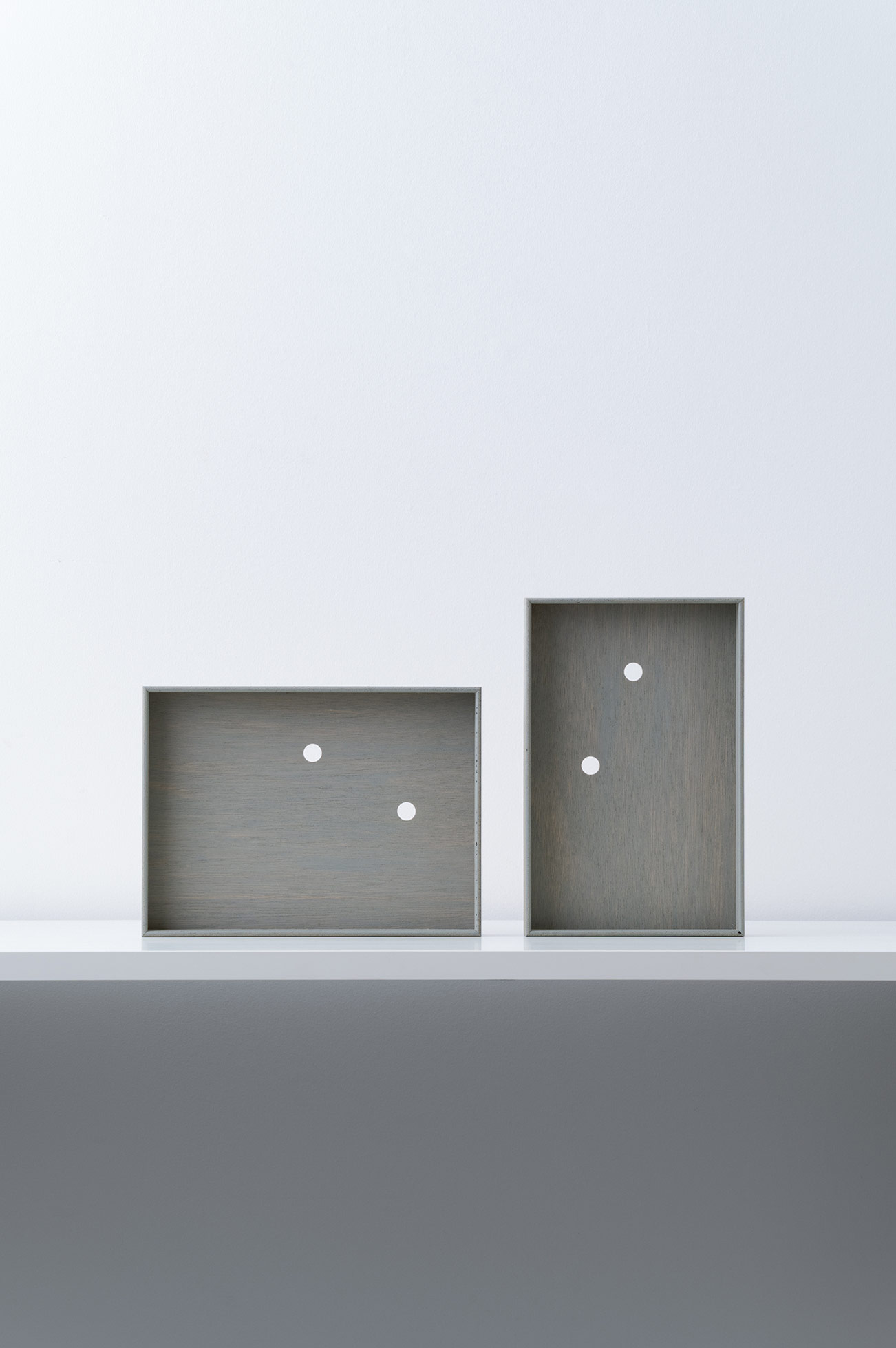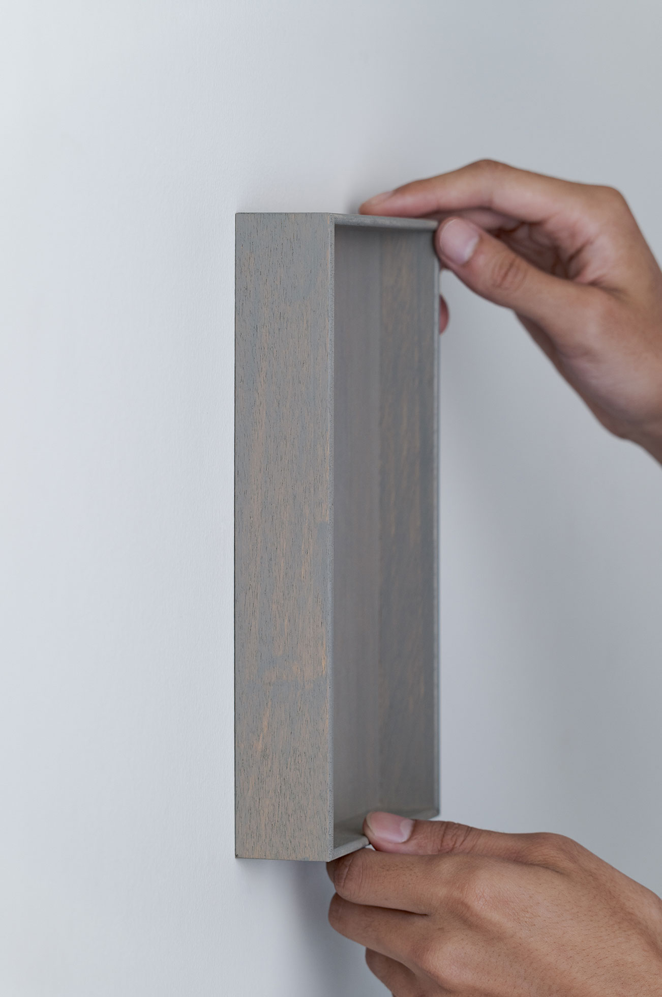 アクリルやガラスの無い、シンプルな箱状のフレームとし、裏面には縦と横どちらの向きでも引っ掛けられるよう二つの穴を備えている。